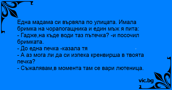 Една мадама си вървяла по улицата. Имала бримка на чорапогащника и един мъж я пита: - Гадже,на къде води таз пътечка? -и посочил бримката. - До една печка -казала тя - А аз мога ли да си изпека кренвирша в твоята печка? - Съжалявам,в момента там се вари лютеница.
