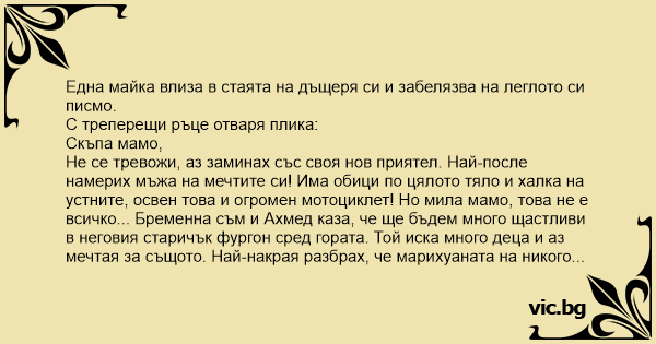 Не се тревожи, аз заминах със своя нов приятел. Най-после намерих мъжа на мечтите си! Има обици по цялото тяло и халка на устните, освен това и огромен мотоциклет! Но мила мамо, това не е всичко... Бременна съм и Ахмед каза, че ще бъдем много щастливи в неговия старичък фургон сред гората. Той иска много деца и аз мечтая за същото. Най-накрая разбрах, че марихуаната на никого не вреди, и затова ще направим малка плантация в гората както за себе си, така и за приятелите на Ахмед. Те пък ни обещаха, че ще ни снабдяват с кокаин и екстази. Моля се учените по-бързо да намерят лекарство против спина, защото Ахмед се влошава с всеки изминал ден, той заслужава по-добра участ! Не се притеснявай мила мамо, вече съм на 15 и мога сама да се погрижа за себе си. Ще се опитам по някакъв начин да ти дойда нагости, за да ти покажа внука!