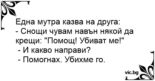 - Снощи чувам навън някой да крещи: "Помощ! Убиват ме!"