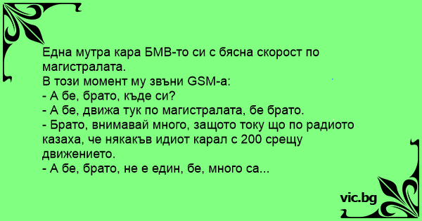 - Брато, внимавай много, защото току що по радиото казаха, че някакъв идиot карал с 200 срещу движението.