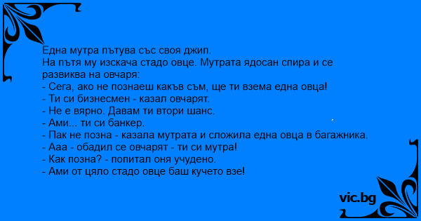 На една блондинка много и се подигравали, че е много глупава и тя решила да си боядиса косата черна. En blondine blev træt af alle de blondine vittigheder der var, og farvede sit hår sort, og kørte en tur på landet. Hun kom forbi en bondegård, med en mark med får. Hun holdte ind og spurgte... Een dom blondje loopt op de Veluwe en ziet daar een herder met zijn schaapjes lopen. "Oh wat leuk" zegt het domme blondje tegen de herder, "ik wil ook zo'n lief schaapje hebben!" "Nou, zegt de... Er was er eens een herder die met zijn schapen langs de kant van de weg liep. Plots dook er een spiksplinternieuwe Cherokee Jeep op, bestuurd door een man in een Hugo Boss hemd, Nike baskets, Rolex... A blonde desserts her home town out of shame, and colors her hair brown. She drives past a farm and sees all the sheep. She goes up to the farmer and ask, "If I guess how many sheep you have can I... Un touriste en train de faire une randonnée en montagne croise un troupeau de moutons avec son berger. Ils discutent de tout et de rien et sur la proposition du touriste en viennent à faire un... Do bacy wypasającego owieczki przyjeżdża człowiek w średnim wieku. Po wyjściu z samochodu pyta: - Baco, co tu robicie? Wypasacie owce? - Tak, panocku. - A baco, jak wam powiem ile macie tych... There once was a blonde who was very tired of blonde jokes and insults directed at her intelligence. So, she cut and dyed her hair, got a make-over, got in her car, and began driving around in the country. Suddenly, she came to a herd of sheep in the road. She stopped her car and went over to the... A man walking along a road in the countryside comes across a shepherd and a huge flock of sheep. He tells to the shepherd: "I will bet you 100 € against one of your sheep that I can tell you the exact number in this flock." The shepherd thinks it over; it’s a big flock so he takes the bet.... Eine Blondine, genervt von den ewigen Blondinenwitze, lässt sich die Haare rot färben und fährt aufs Land. Auf dem Weg dorthin trifft sie einen Hirten mit seiner Schafherde. Sie sagt ihm: "Wenn ich herausfinde wieviele Schafe Du hast darf ich eines mitnehmen, alles klar?" Der Hirte: "Ok"... There was a typical blonde. She had long, blondehair, blue eyes, and she was sick of all theblonde jokes. One day she decided to get makeover. She cutand dyed her hair brunette and went drivingdown a country road, searching for someonewho would appreciate her for her intelligence. When she came... Cansada das brincadeiras sobre sua burrice, a loira resolveu pintar o cabelo de preto. Para comemorar o novo visual, foi dar uma volta de carro pelo campo e la encontrou um pastor de ovelhas. — Bom dia, senhor pastor! Que lindo rebanho o senhor tem! — Obrigado! — Se eu acertar quantas ovelhas há... Некој овчар си пасел овци,дошол некој цајкан без униформа и му рекол: блондинка решила доказать, что она не дура. для этого она... Η ΒΑΜΕΝΗ ΞΑΝΘΙΑ Der Schäfer und der TT Fahrer Gefärbte Blondine beim Schäfer Blonde Counting Sheep Blonde in Disguise A dumb blonde was really tired of being made fun of, so she decided to have her hair she would look like a brunette. When she had brown hair, she decided to take a drive in the country. After she... A blonde got tired of everyone treating her like she was dumb so she decided to dye her hair brown. She went out and about in the world to prove that she was smart. She came upon a sheep farmer and... Once upon a time, a blonde became so sick of hearing blonde jokes that she had her hair cut and dyed brown. A few days later, as she was out driving around the countryside, she stopped her car to... One day a blonde woman named Sally finally got tired of everyone assuming she was stupid because of her hair color. She decided to go to the hairdressers and have her hair dyed brown. Feeling quite... Rigtig blondine? Blondinen er træt af at blive kaldt dum så hun tager en sort paryk på og kører sig en tur i bilen. Hun kommer til et vejkryds hvor der står en hyrde med sine får. Blondinen vil... Det var en gang en blondine som var lei av alle blondine-vitsene, og farget derfor håret brunt for å se om hun bli smartere. Litt senere på dagen kjørte hun forbi en bondegård med sauer. Hun sa til... Det var en gång en blondin, som ville prova om det var sant det som folk säger om blondiner. Hon färgade håret kastanjebrunt, och åkte ut på landet, och stannade vid en bondgård. - Nu skall jag... Jede přebarvená blondýnka na kole a potká baču se stádem ovcí. V dobrém rozmaru navrhne: „Když ti povím, kolik máš přesně ovcí, dáš mi jednu?” Bača souhlasí. Exblondýnka mu to řekne, strefí se a... Sikke et får En blondine ville bevise over for sig selv og for andre, at blondiner var knap så dumme som folk troede, så hun farvde sit hår brunt og drog ud for at bevise. Da hun var kommet godt ud... Blondinen på landet Så var der blondinen der farvede sit hår og kørte en tur på landet. Efter et stykke tid blev hun stoppet af en hel masse får der blokerede vejen. Blondinen fandt frem til...