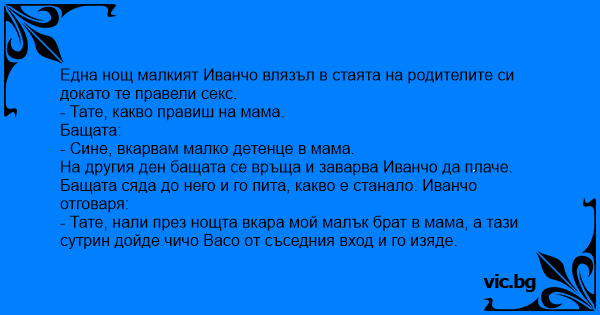 Една нощ малкият Иванчо влязъл в стаята на родителите си докато те правели cekc.