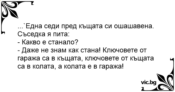 - Даже не знам как стана! Ключовете от гаража са в къщата, ключовете от къщата са в колата, а колата е в гаража!