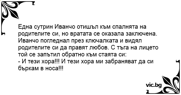 Иванчо погледнал през ключалката и видял родителите си да правят любов. С тъга на лицето той се запътил обратно към стаята си:
