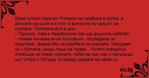 - Нямам никаква вина полковник - оправдава се поручика - Вчера бях на сватбата на корнета. Танцувам си с булката, нищо лошо не правя... Когато изведнъж отнякъде се появи корнета, побегна към нас и какъъъъв шут отпра с ботуша си между краката на жена си...