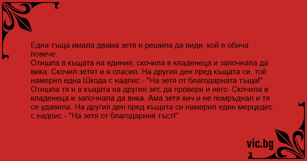 Отишла тя и в къщата на другия зет, да провери и него. Скочила в кладенеца и започнала да вика. Ама зетя хич и не помръднал и тя се удавила. На другия ден пред къщата си намерил един мерцедес с надпис - "На зетя от благодарния тъст!"