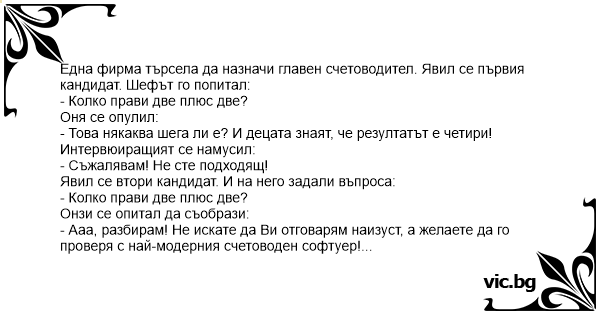Една фирма търсела да назначи главен счетоводител. Явил се първия кандидат. Шефът го попитал: