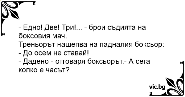 - Дадено - отговаря боксьорът.- А сега колко е часът?