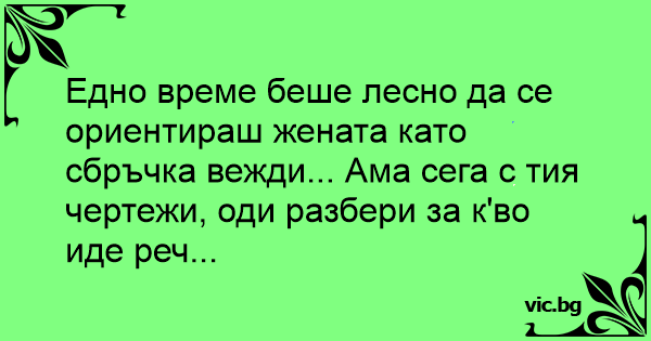 Едно време беше лесно да се ориентираш жената като сбръчка вежди... Ама сега с тия чертежи, оди разбери за к'во иде реч...