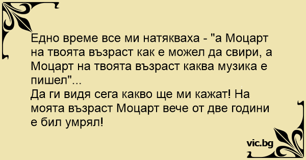 Едно време все ми натякваха - "а Моцарт на твоята възраст как е можел да свири, а Моцарт на твоята възраст каква музика е пишел"...