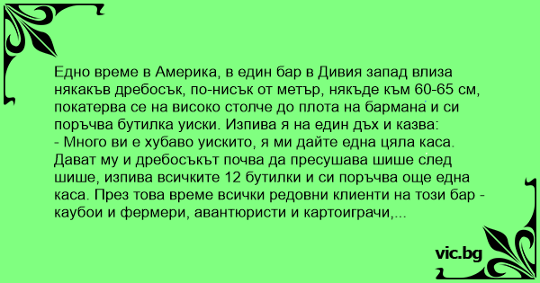 Едно време в Америка, в един бар в Дивия запад влиза някакъв дребосък, по-нисък от метър, някъде към 60-65 см, покатерва се на високо столче до плота на бармана и си поръчва бутилка уиски. Изпива я на един дъх и казва: