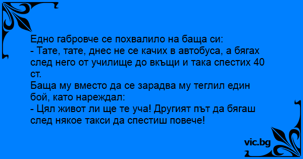 - Тате, тате, днес не се качих в автобуса, а бягах след него от училище до вкъщи и така спестих 40 ст.