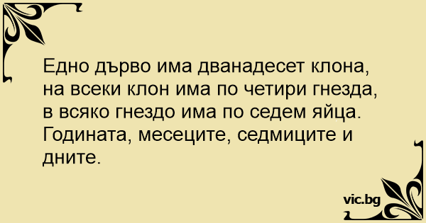 Едно дърво има дванадесет клона, на всеки клон има по четири гнезда, в всяко гнездо има по седем яйца.