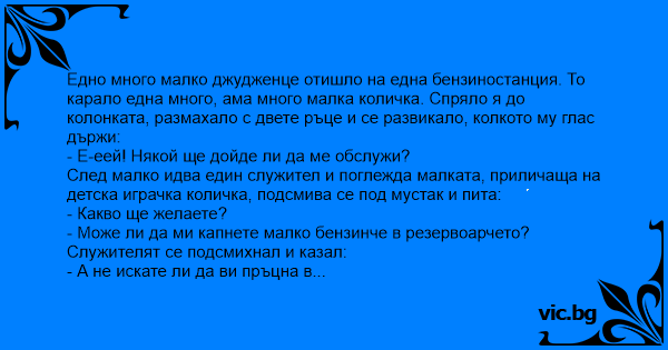 Едно джудже отива на бензиностанцията със своята миниатюрна количка и казва на бензинаджията: