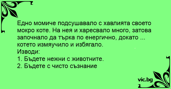 Едно момиче подсушавало с хавлията своето мокро коте. На нея и харесвало много, затова започнало да търка по енергично, докато ... котето измяучило и избягало.