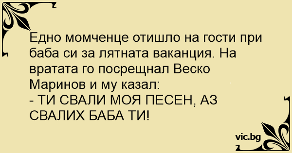 Едно момченце отишло на гости при баба си за лятната ваканция. На вратата го посрещнал Веско Маринов и му казал: