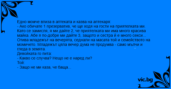20 годишен мъж влиза в аптека и иска презервативи. Фармацефтът го пита: