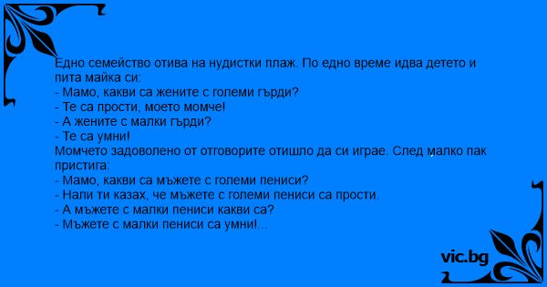 Едно семейство отива на нудистки плаж. По едно време идва детето и пита майка си: