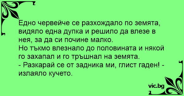 Едно червейче се разхождало по земята, видяло една дупка и решило да влезе в нея, за да си почине малко.
