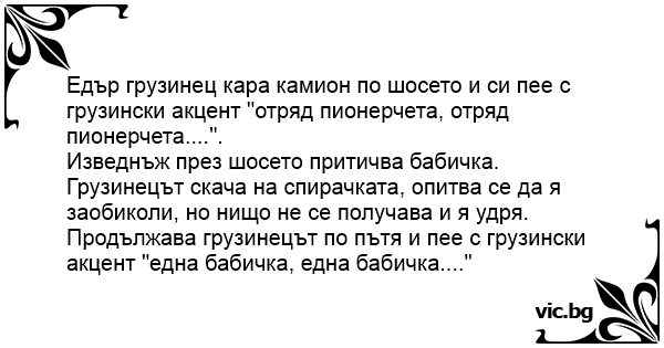 Едър грузинец кара камион по шосето и си пее с грузински акцент "отряд пионерчета, отряд пионерчета....".