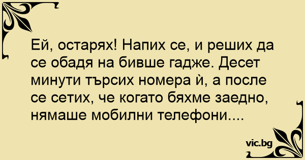 Ей, остарях! Напих се, и реших да се обадя на бивше гадже. Десет минути търсих номepa ѝ, а после се ceтиx, че когато бяхме заедно, нямаше мобилни телефони....
