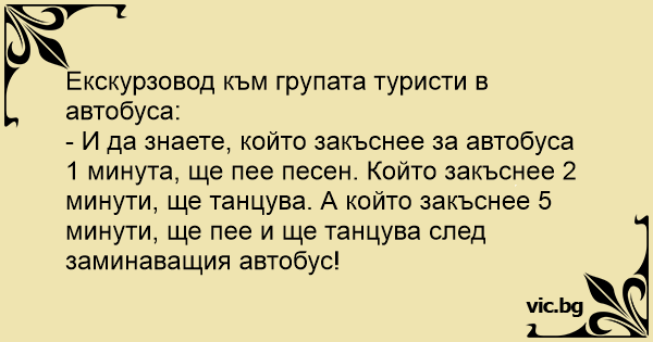 - И да знаете, който закъснее за автобуса 1 минута, ще пее песен. Който закъснее 2 минути, ще танцува. А който закъснее 5 минути, ще пее и ще танцува след заминаващия автобус!
