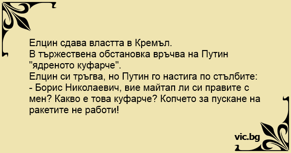 - Борис Николаевич, вие майтап ли си правите с мен? Какво е това куфарче? Копчето за пускане на ракетите не работи!