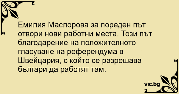 Емилия Маслорова за пореден път отвори нови работни места. Този път благодарение на положителното гласуване на референдума в Швейцария, с който се разрешава българи да работят там.