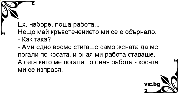 - Ами едно време стигаше само жената да ме погали по косата, и оная ми работа ставаше. А сега като ме погали по оная работа - косата ми се изправя.