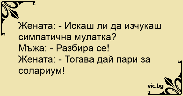 Дружина: — Хочеш трахнути симпатичну мулатку? Чоловік: — Звісно! Дружина: — Тоді дай грошей на солярій!