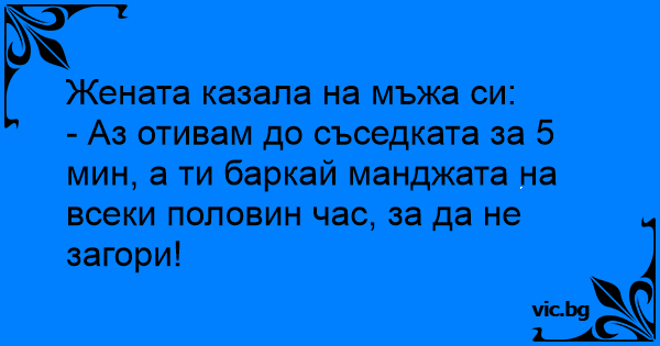 - Аз отивам до съседката за 5 мин, а ти баркай манджата на всеки половин час, за да не загори!