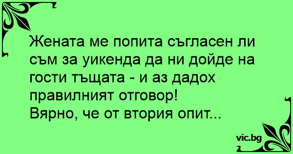 Жената ме попита съгласен ли съм за уикенда да ни дойде на гости тъщата - и аз дадох правилният отговор!