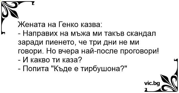 - Направих на мъжа ми такъв скандал заради пиенето, че три дни не ми говори. Но вчера най-после проговори!