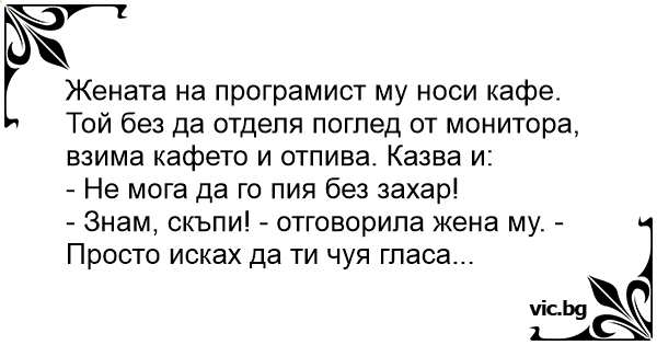 Жената на програмист му носи кафе. Той без да отделя поглед от монитора, взима кафето и отпива. Казва и: