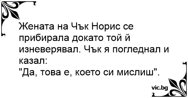Жената на Чък Норис се прибирала докато той й изневерявал. Чък я погледнал и казал: