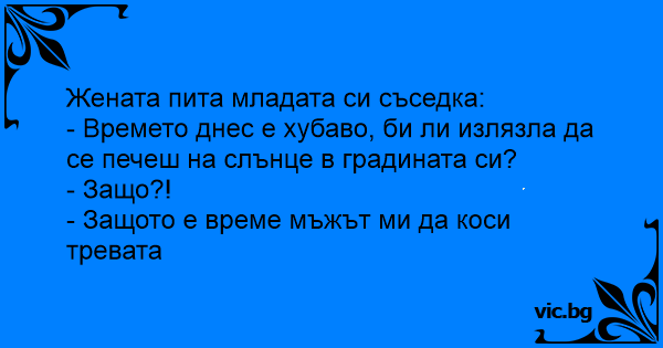 Chiede la donna alla sua giovane vicina: - "Le andrebbe di prendere il sole in bikini nel suo giardino?" - "Perché" - "Perche sarebbe l'ora che mio marito si mettesse a tosare l'erba" A szomszéd asszonyhoz: - Tudna ma a teraszon napozni? - Miért? - Mert akkor a férjem végre lekaszállja a füvet a kertünkben. Жена към младата съседка: - Здрасти, може ли днес да се печеш на двора? - Защо!? - Иска ми се моя най-накрая да окоси тревата в градина.