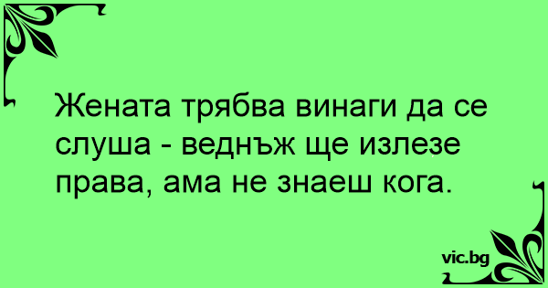 Жената трябва винаги да се слуша - веднъж ще излезе права, ама не знаеш кога.