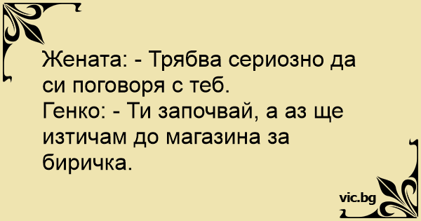 Генко: - Ти започвай, а аз ще изтичам до магазина за биричка.