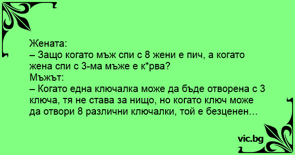 – Защо когато мъж спи с 8 жени е пич, а когато жена спи с 3-ма мъже е kуpba?