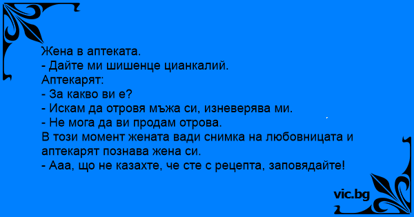 Рецепт La mujer en busca de Arsénico Arsen aus der Apotheke Ο Φαρμακοποιός Δηλητήριο Влиза мъж в аптека. Жена влегува во аптека и бара да купи отров. Ein Mann möchte seine Frau umbringen. Er geht zur Apotheke und verlangt Zyankali. Der Apotheker mustert ihn streng und meint: Le pharmacien au client: Аптекаря: Жена разбрала за изневярата на мъжа си и решава да го отрови с хапчета. Влиза въпросната дама при доктора и казва: A nice, calm and respectable lady went into the pharmacy, right up to the pharmacist, looked straight into his eyes, and said, "I would like to buy some cyanide." - Скажите, у вас есть мышьяк? Una donna entra in farmacia e chiede: A woman walks into a pharmacy Une femme se rend dans une pharmacie et demande de l'arsenic. Le pharmacien lui demande : Kommt ein Mann in die Apotheke und verlangt 50 Gramm Arsen. Fragt der Verkäufer: "Haben Sie dafür ein Rezept?" "Nein, aber ein Bild von meiner Schwiegermutter..." A man who wants to murder his wife goes in a pharmacy and asks for cyanide. "I'm sorry sir, but I can't give you cyanide just like that." Without a word, the man takes out his wife's photograph and holds it in front of him. The pharmacist apologizes, "My mistake, I didn't realize you had a... Kommt ein Mann in die Apotheke und sagt: „Bitte geben sie mir eine Packung Strychnin.“ Apotheker: „Wofür brauchen Sie das?“ Mann: „Ich will meine Frau ermorden.“ Apotheker: „Das können Sie doch nicht machen.“ Der Mann zieht ein Foto seiner Frau aus der Tasche und zeigt es dem Apotheker.... Przychodzi baba do apteki i mówi do aptekarza, że chce kupić arszenik. - Po co pani arszenik? - pyta aptekarz. - Chcę otruć mojego męża, który mnie zdradza. - Droga pani, nie mogę pani sprzedać arszeniku, aby pani zabiła męża, nawet w przypadku gdy sypia z inną kobietą. Na to kobieta wyciąga... Een dame wandelt de apotheek binnen en vraagt er wat arsenicum. "Waarvoor hebt u dat nodig, mevrouw?". "Om mijn man te vermoorden..." "Daarvoor mag ik u dat niet verkopen.". De dame haalt uit haar... Kadının biri, eczaneye dalar ve bir şişe arsenik ister. Eczacı, kadına arsenikle ne yapacağını sorar. Kadın: -Kocamı öldüreceğim! diye cevap verir. Eczacı: -Kusura bakmayın ama size bu sebeple... Uma mulher entra em uma farmácia e pede ao farmacêutico: - Por favor, gostaria de comprar um vidro de morfina. - Mas, minh asenhora, eu não posso verder este produto assim... Mas pra que é que você... Ein Mann, der seine Frau umbringen will, geht in die Apotheke und verlangt Zyankali. Der Apotheker: "Tut mir leid, ich kann ihnen das nicht einfach so rausgeben." Der Mann holt ein Bild von seiner... Uma mulher entra na farmácia e pede ao atendente que lhe traga 10g de cianureto. O rapaz, curioso, pergunta para quê ela precisa dessa substância tão letal. Ao que ela responde com a maior calma do... Una dama entra a una farmacia y le pide al farmacéutico: - Por favor, quisiera comprar arsénico. Dado que el arsénico es muy tóxico y letal, el farmacéutico quiso saber más datos antes de... Manden på apoteket: - Jeg vil gerne have lidt arsenik til min svigermor. - Har de recept? - Nej, men jeg har et billede Una señora entra en una farmacia y le pide al farmacéutico un frasco de arsénico. El doctor dice: - ¡Señora! ¿para qué quiere el arsénico? - Para matar a mi marido, -responde tranquila la señora. -... Una donna va in farmacia: "mi può dare il veleno più potente che ha" ed il farmacista: "a cosa le serve?" e la donna: "a uccidere mio marito" il farmacista: "non posso" e la donna caccia una foto... Ei käy, apteekkari sanoi asiakkaalle. - Arsenikin ostoon pitää olla lupa. Pelkkä anopin kuva ei käy. Apotekeren siger til kunden: - Nej da! Jeg kan ikke bare give dig Arsenik, bare sådan! Jeg skal have en recept, før jeg udleverer det! - Okaj, okaj! Hvad nu hvis jeg viser dig et billede af min... Egy nő bemegy a gyógyszertárba. - Patikus úr! Olyan mérget szeretnék venni, amivel gyorsan megölhetem a férjemet. - Hogy képzeli asszonyom, én ilyet nem adhatok önnek! Erre az asszony elővesz egy... A nő bemegy a patikába és mérget kér. A patikus meglepődik: - Asszonyom, miért van szüksége méregre? - Megölöm a férjemet. - Nagyon sajnálom, de nem adhatok el önnek mérget azért, hogy megöljön... En kvinna kom in på apoteket och ville köpa arsenik. Apotekaren undrade vad hon skulle ha det till. Jo, hon skulle ta livet av sin man... - Men jag kan ju inte sälja arsenik till dig när du ska ta... En una pequeña farmacia del pueblo entra una señora y dice: - Por favor, quiero comprar arsénico! - No puedo venderle eso. ¿Cuál es su finalidad? - ¡Matar a mi marido! - Mucho peor, para ese fin no... Een man komt bij de apotheker en hij vraagt wat arsenicum voor zijn schoonmoeder. "heeft u een voorschrift?" zegt de apotheker? "nee, maar wel een foto!" A patikus így szól a pult előtt álló izgatott férfihez: - Sajnálom, uram! Ahhoz, hogy arzént vegyen, recept is kell, nem elég az anyósa fényképe. En kvinna kom in på apoteket och ville köpa arsenik. - Vad ska ni ha det till frågade apotekaren? - Jag ska ta livet av min man!!! Apotekaren: - Jag kan inte sälja arsenik för att ni ska döda eran... Nainen käveli apteekkiin ja pyysi miesapteekkarilta syanidia ja nopeasti. Myyjä luonnollisesti huolestui moisesta pyynnöstä ja kysyi: - ”Miksi ihmeessä te tarvitsette syanidia?” Nainen selitti,... Aptiekā. - Cienījamais, lai iegādātos indi, nepieciešama recepte! - Ar sievas mātes fotogrāfiju nepietiks?! A lady walks into a drug store and tells the pharmacist she needs some cyanide. Then the lady reached into her purse and pulled out a picture of her husband in bed with the pharmacist’s wife. The... Egy ass