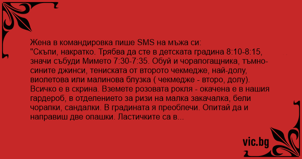 "Скъпи, накратко. Трябва да сте в детската градина 8:10-8:15, значи събуди Мимето 7:30-7:35. Обуй и чорапогащника, тъмно-сините джинси, тениската от второто чекмедже, най-долу, виолетова или малинова блузка ( чекмедже - второ, долу). Всичко е в скрина. Вземете розовата рокля - окачена е в нашия гардероб, в отделението за ризи на малка закачалка, бели чорапки, сандалки. В градината я преоблечи. Опитай да и направиш две опашки. Ластичките са в най-горното чекмедже на скрина, в бяла кутийка под обувките с картинки. После виж какво е времето. Или и сложи розовото палто, виолетовата шапка и розовия шал, или зеленото, пухкаво , същия цвят шапка, без шал, на крачетата - новите ботушки. Провери и наготви всичко тази вечер. Ако нещо не намериш, звънни и питай, не спя още."