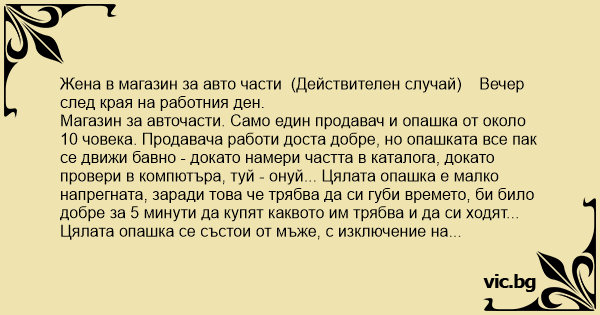 Жена в магазин за авто части (Действителен случай) Вечер след края на работния ден.