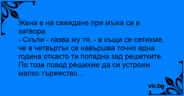 - Скъпи - казва му тя, - в къщи се сетихме, че в четвъртък се навършва точно една година откакто ти попадна зад решетките. По този повод решихме да си устроим малко тържество...