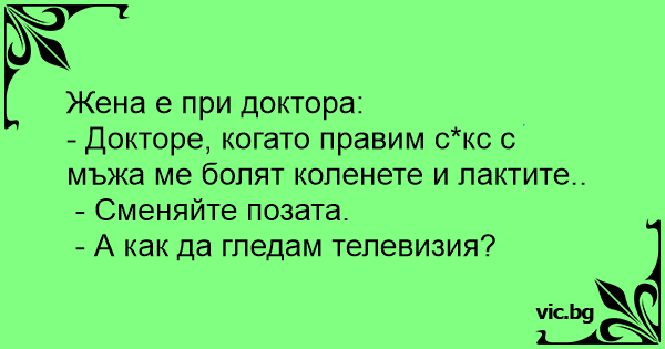 - Докторе, когато правим cekc с мъжа ме болят коленете и лактите..