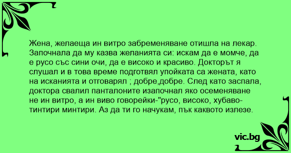 Започнала да му казва желанията си: искам да е момче, да е русо със сини очи, да е високо и красиво. Докторът я слушал и в това време подготвял упойката са жената, като на исканията и отговарял ; добре,добре. След като заспала, доктора свалил панталоните изапочнал яко осеменяване не ин витро, а ин виво говорейки-"русо, високо, хубаво-тинтири минтири. Аз да ти го начукам, пък каквото излезе.
