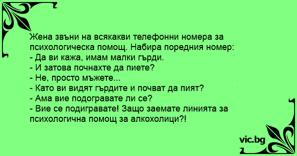 Жена звъни на всякакви телефонни номера за психологическа помощ. Набира поредния номер: