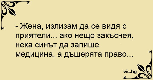 - Жена, излизам да се видя с приятели... ако нещо закъснея, нека синът да запише медицина, а дъщерята право...
