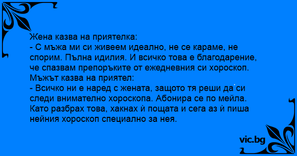 - Всичко ни е наред с жената, защото тя реши да си следи внимателно хороскопа. Абонира се по мейла. Като разбрах това, хакнах ѝ пощата и сега аз ѝ пиша нейния хороскоп специално за нея.