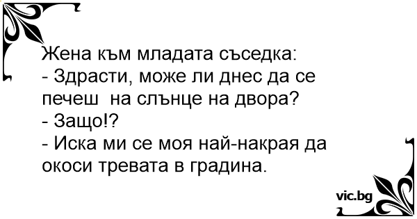 Жената пита младата си съседка: - Времето днес е хубаво, би ли излязла да се печеш на слънце в градината си? - Защо?! - Защото е време мъжът ми да коси тревата