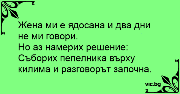 Жена ми ми е лута. Два дена муабет не ми прави.Ама имало решение: Ми падна пепеларата врз тепихот и разговорот започна.
